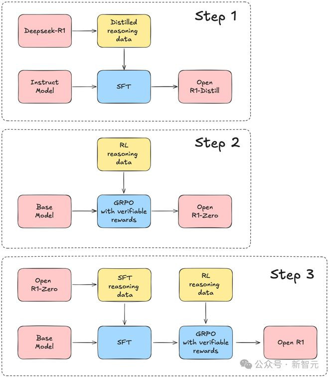 研究团队以DeepSeek-R1技术报告为指导,将整个复刻过程划分为三个关键步骤。
