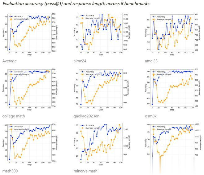 如下所示,所有基准测试的准确率在训练过程中都在稳步提高,而输出长度则呈现先减少后逐渐增加的趋势。
