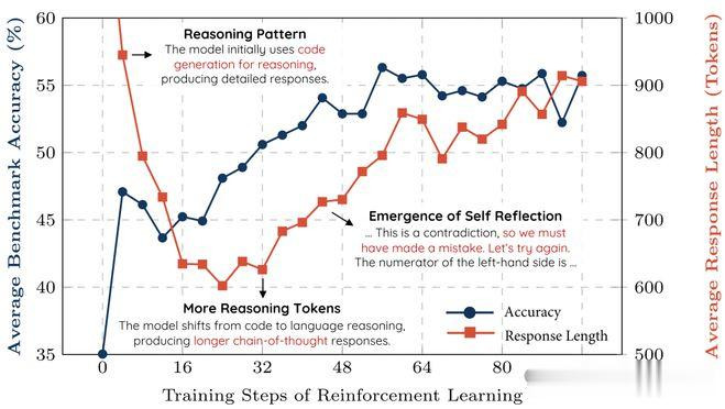 模型从最初的简单输出开始,逐步进化出自我纠正和搜索的策略。