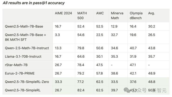 Qwen2.5-7B-SimpleRL则首先通过LongCoT监督微调(SFT)作为冷启动,然后再进行强化学习。