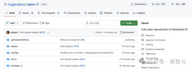 这个项目叫做OpenR1,当前还在进行中。发布到一天,星标冲破1.9k,斩获142个fork。