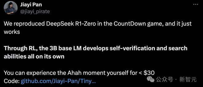 [新智元导读]就在刚刚,网上已经出现了一波复现DeepSeek的狂潮。UC伯克利、港科大、HuggingFace等纷纷成功复现,只用强化学习,没有监督微调,30美元就能见证「啊哈时刻」!全球AI大模型,或许正在进入下一分水岭。