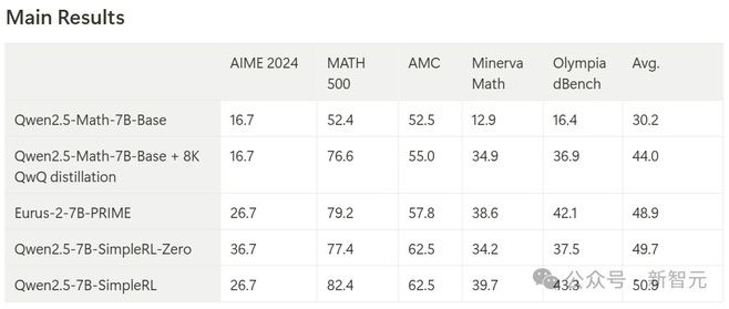 与RL训练前的模型(Qwen2.5-Math-7B-Base+8KQwQ知识蒸馏版本)相比,Qwen2.5-7B-SimpleRL的平均性能显著提升了6.9个百分点。
