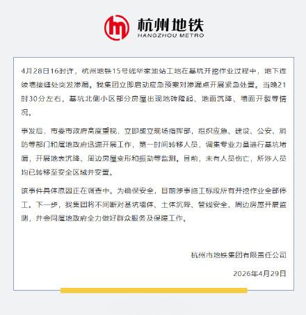 4月29日,杭州地铁发布情况通报:4月28日16时许,杭州地铁15号线华家池站工地在基坑开挖作业过程中,地下连续墙接缝处突发渗漏。我集团立即启动应急预案对渗漏点开展紧急处置。当晚21时30分左右,基坑北侧小区部分房屋出现地砖隆起、地面沉降、墙面开裂等情况。