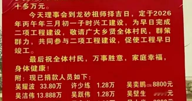 今天理事会到龙砂祖师择吉日,定于2026年丙午年三月初一子时兴工建设,为早日完成二项工程建设,敬请广大乡贤全体村民,群策群力,共同参与二项工程建设,促使工程早日竣工。