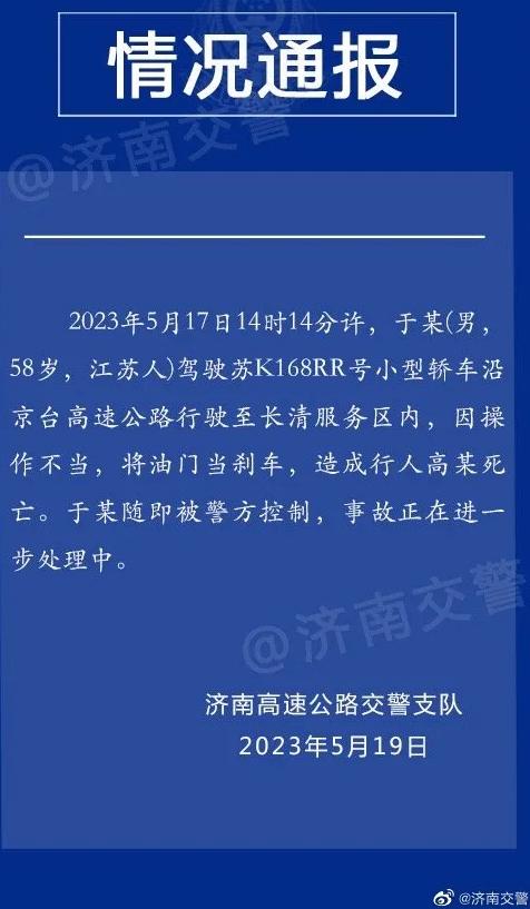 山东济南警方通报男子在服务区被撞飞身亡:驾驶人因操作不当,将油门当刹车,造成1人死亡,驾驶人已被控制。
