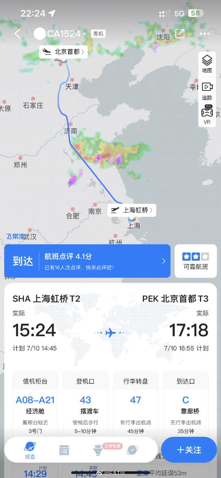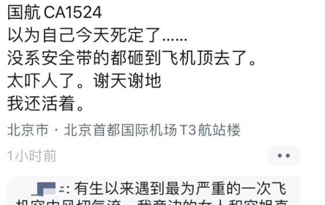 今天多位网友发帖称,上海飞往北京的CA1524航班,在空中遭遇了严重颠簸。