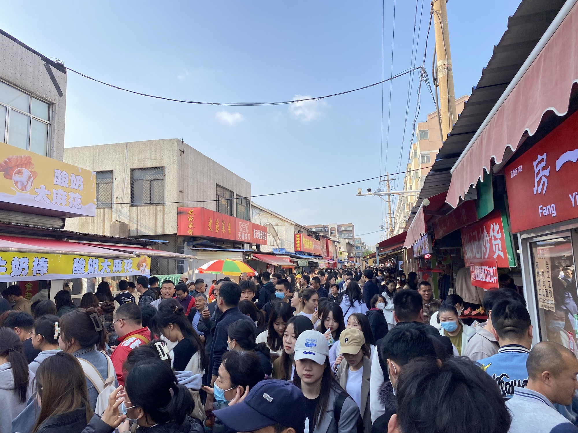 位于淄博张店区中心的八大局便民市场,原本就是附近居民买菜做饭的普通市场。游客涌入之后,不管是卖猪肉的档口,还是卖馒头的店铺,通通卖起了网红紫米糕、炒锅饼和牛奶棒,纷纷标榜自己才是“推广第一家”“抖音可查”。