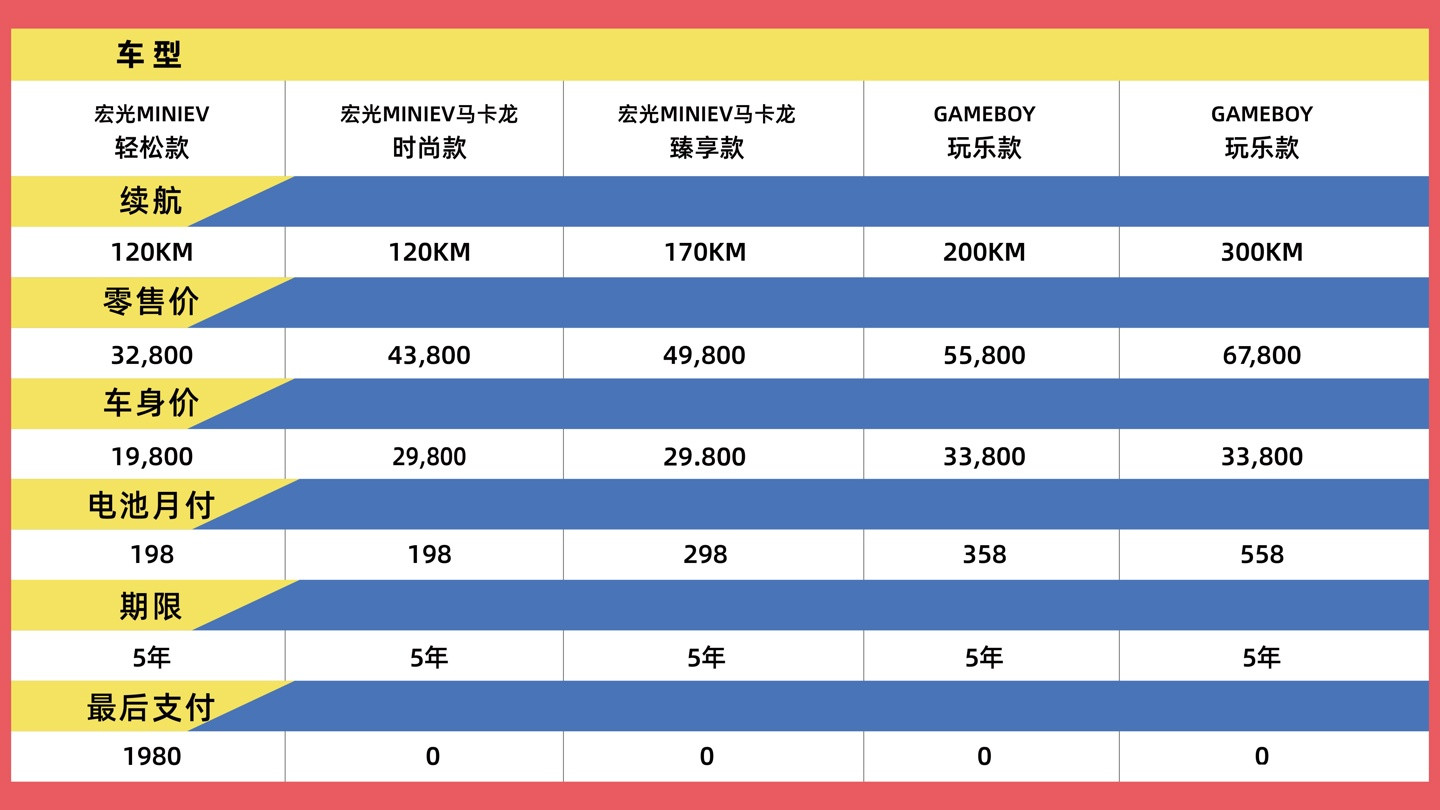 IT之家注意到,宏光MINIEV“轻松来电”购车方案涉及车型包括宏光MINIEV轻松款、马卡龙时尚款、臻享款、GAMEBOY玩乐款,且涵盖120km、170km、200km和300km不同续航版本。
