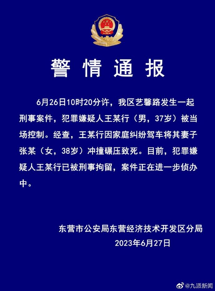 东营市公安局东营经济技术开发区分局发布通告:6月26日10时20分许,我区艺馨路发生一起刑事案件,犯罪嫌疑人王某行 (男,37岁) 被当场控制。经查,王某行因家庭纠纷驾车将其妻子张某(女,38岁)冲撞碾压致死。目前,犯罪嫌疑人王某行已被刑事拘留,案件正在进一步侦办中。