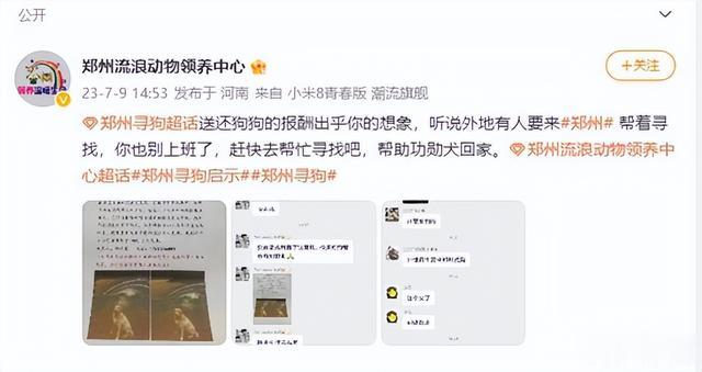"郑州流浪动物领养中心"也配文称:"送还狗狗的报酬超出你的想象,听说外地游人要来郑州帮着寻找,你也别上班了,赶快去帮忙寻找吧。"