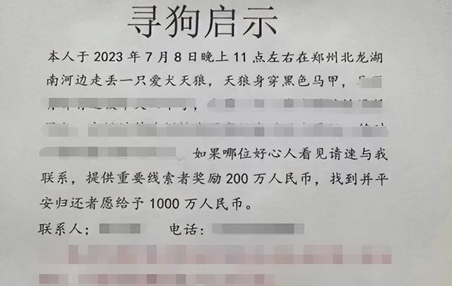 7月9日,“郑州流浪动物领养中心”发布了一则特殊的寻狗启事,如果能提供重要线索者,狗主人奖励200万人民币,如果找到并平安归还,狗主人愿给予1000万人民币。启事的末尾,还有一句红字称,如果伤害这条功勋犬,倾家荡产也要追究到底。