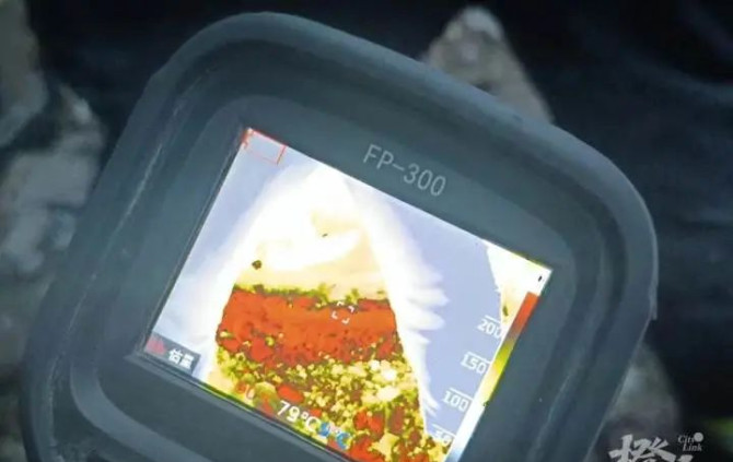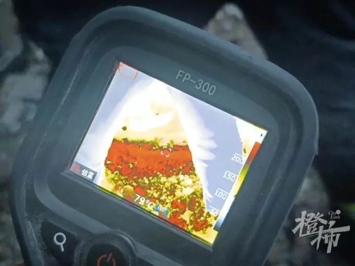 消防员拿出专业用测温仪一测量,这块地面区域温度已经接近80℃。