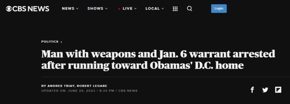 综合哥伦比亚广播公司(CBS)等美媒报道,美国执法部门消息人士称,当地时间6月29日,一名携带爆炸材料和武器的男子在美国前总统奥巴马位于华盛顿特区的住所附近被捕。据了解,该男子因涉嫌参与2021年1月6日美国国会山骚乱而被通缉。