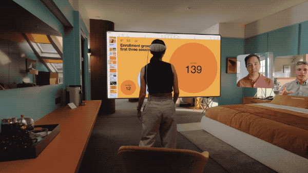 通过这些交互,你可以随意调节应用的大小和位置,例如可以把电影放大到 100 英尺,填满整个房间,或者把 Facetime 的对象拉到你的面前,和你面对面聊天。