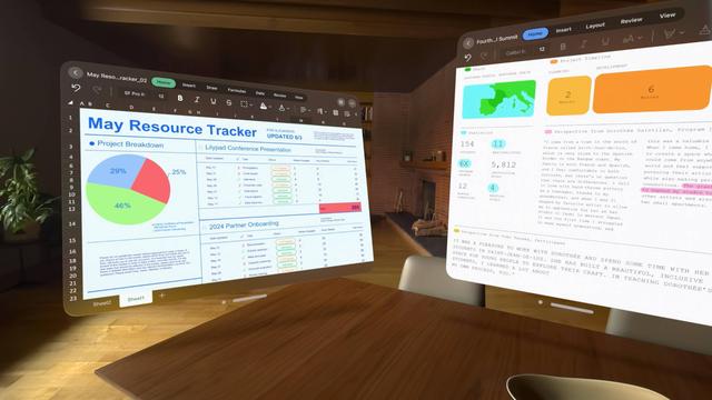 visionOS 同时上面了很多专属应用,你甚至还可以用 Vision Pro 来做 Word、PPT,沉浸式办公。整个世界都是你的画板,你可以根据需求调整它们的大小。