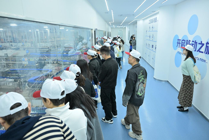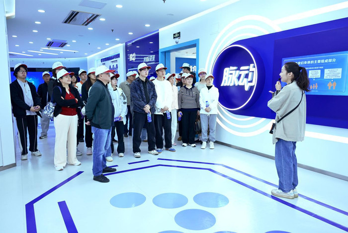 在“绿色工厂展厅”,志愿者们在讲解员司铱苹的带领下开启实地探访之旅。