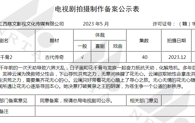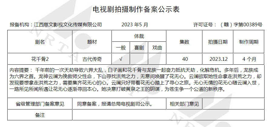 据广电总局办公厅关于2023年5月全国拍摄制作电视剧备案公示的通知,由江西慈文影视文化传媒有限公司报备的电视剧《花千骨2》拟定于2023年12月开拍,拍摄集数为40集,制作周期为4个月。
